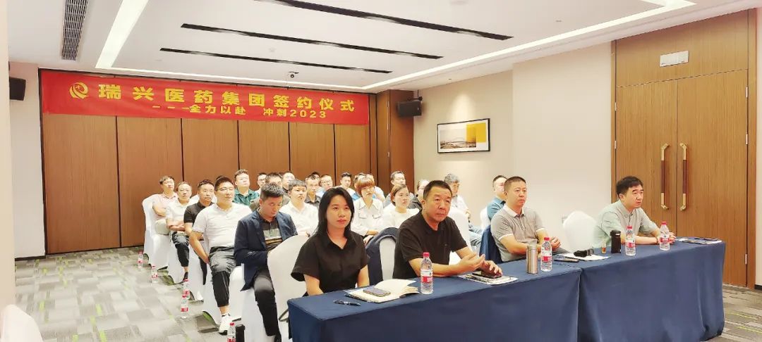 2023年7月16日,瑞興醫(yī)藥集團(tuán)營銷中心2023年任務(wù)責(zé)任狀簽約儀式,半年度工作總結(jié)大會(huì)在公司總部隆重舉行。黃凌云董事長、欒廣根總經(jīng)理、周益副總經(jīng)理、營銷中心總經(jīng)理陳廣明攜總部全體人員共同參會(huì)。