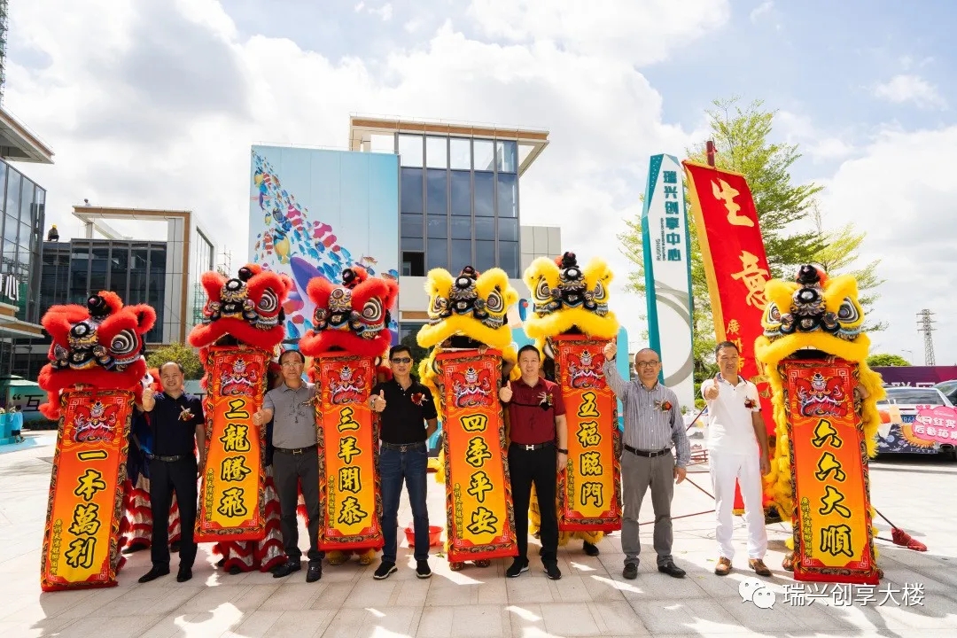 廣東瑞興醫(yī)藥股份有限公司董事長黃凌云先生與一眾嘉賓領(lǐng)導(dǎo)為【瑞興創(chuàng)享中心】開放典禮進(jìn)行剪彩儀式,并在眾多賓客矚目下,6位領(lǐng)導(dǎo)上前為6只舞動的瑞獅點(diǎn)睛。